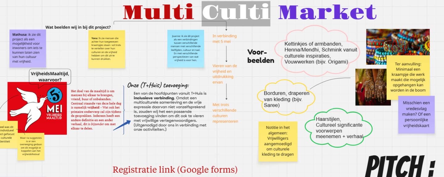 For my portfolio project, I initiated and led the development of the Freedom Market, a multicultural community event organized alongside the May 5th Freedom Meal at ’t Stadshof, in collaboration with T+Huis, Café Doe Mee, and the National Committee.I felt strongly about creating a space where different cultures could be celebrated within a country that embraces diversity and supports immigration. My vision was to design a vibrant, accessible and easygoing market wherein we could celebrate our cultural differences, as I find diversity an aspect of freedom -- as well. I realized this through my internship at T-HUIS.