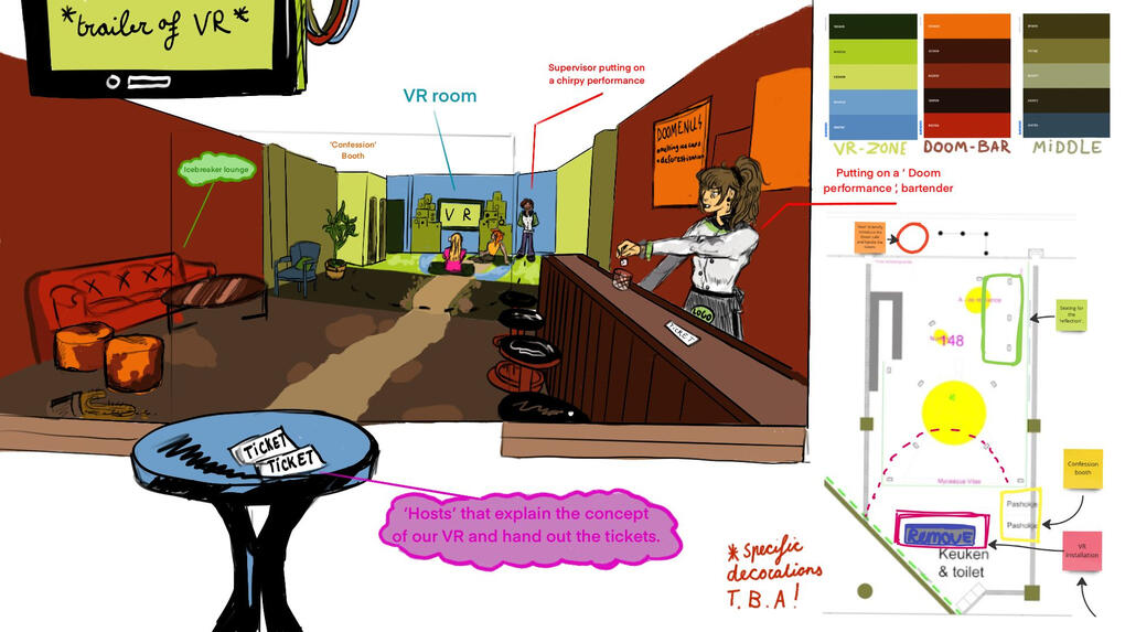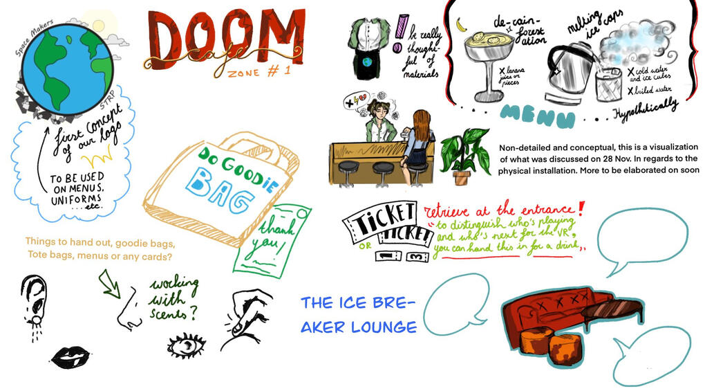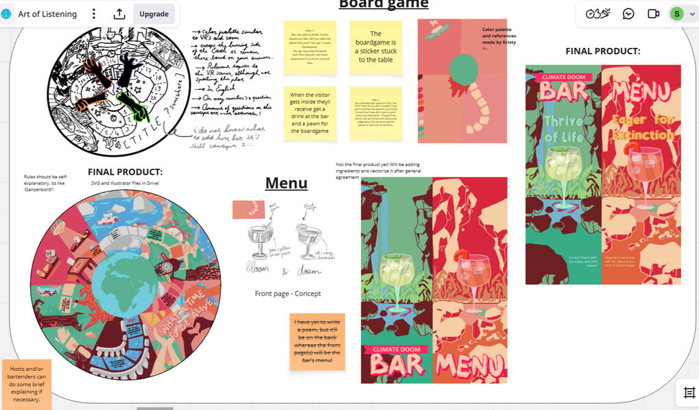 What was my role? Since I originally opted for physical installation management, my role was to design a color palette and conceptualize a performance art adherent to the climate and sustainability theme. Which I would then put together with the rest of the installation-department. However, I was later also tasked to design both a Menu and a Gameboard inspired by Kristyvalie's Branding poster. Below are different sketches and mid-work pictures of each department I worked in/for. (Plus my minor VR contributions)